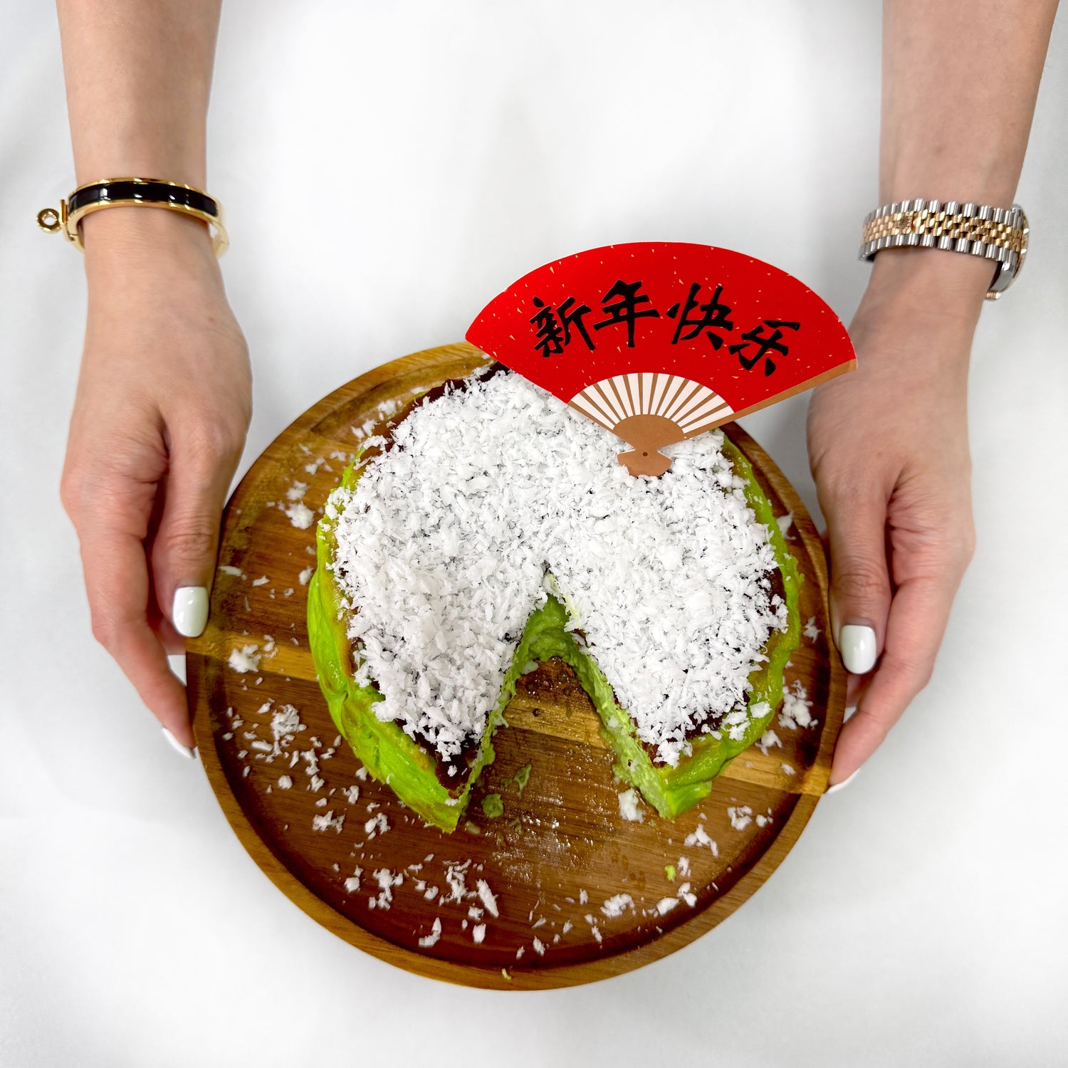 A modern twist on tradition: our Pandan Cloud Burnt Cheesecake, infused with pandan and coconut, and topped with a delicate halo of freshly grated coconut - perfect for your festive table.